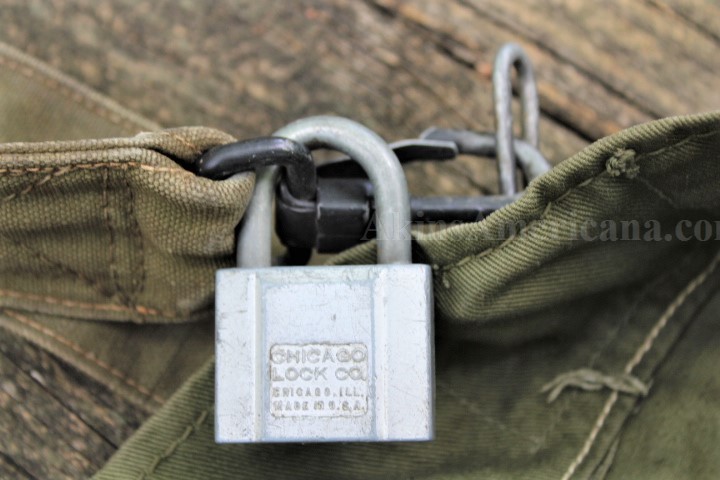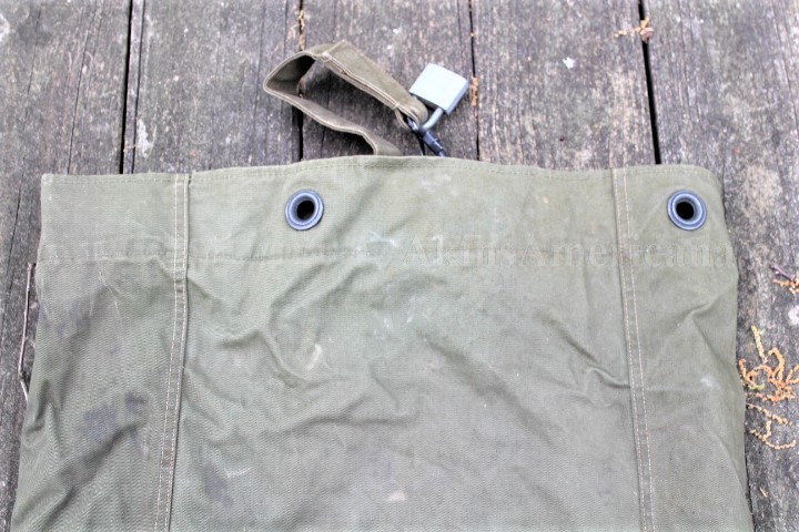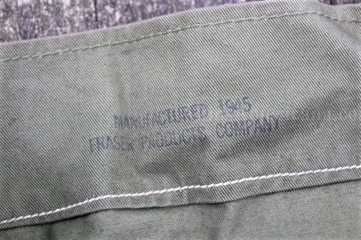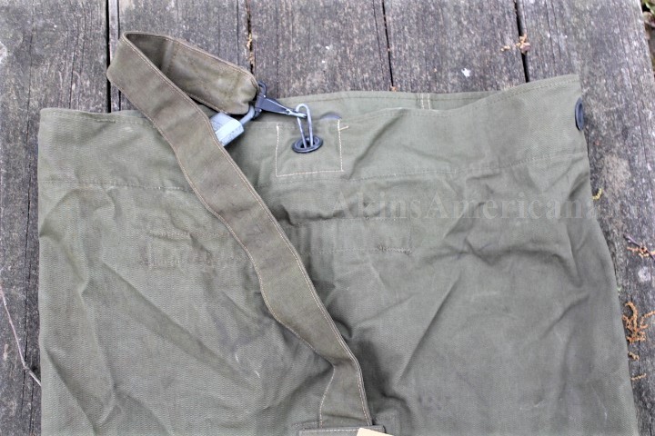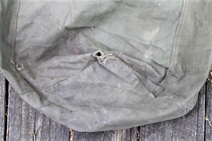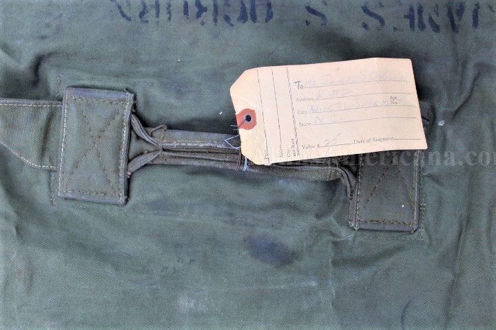 This is a US Army duffel bag from WWII identified to James S Osborn. I haven't been able to do any research on him, so here's a project for somebody! This authentic WWII duffel bag is made of heavy cotton duck canvas in olive drab #7 color. The bag has a single 2" wide carrying strap that was worn over the shoulder. The bag measures approximately 37" x 12" X 12". There are three metal grommets and one metal eyelet sewn into the top of the bag, to secure the bag. A snap hook sewn onto the carrying strap keeps the bag closed during transport. This one is stamped in black on the inside, "MANUFACTURED 1945/FRASER PRODUCTS COMPANY". Stenciled in black on the side below the carrying handle is the name JAMES S OSBORN and his service number 14165767. On the same side of the bag, at the bottom, a stencil reads G1-B119AA-?-A-3. Both stencils are one inch lettering and numbers. These are the only markings on the outside of the bag. There are three tears in the bag, all three about an inch long near the bottom. The carrying handle is still securely sewn onto the bag. All the stitching is still tight and unbroken. The rail shipping tag is still wired to the bag and reads Mr James S Osburn/ R#2/Winston Salem/N.C. with a declared value of $25. This is a nice, inexpensive item to start out your WWII collector with, plus they'll have some fun finding out who Mr Osburn was!