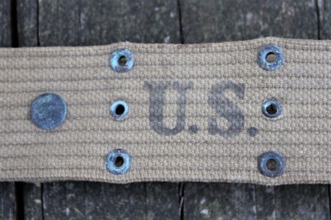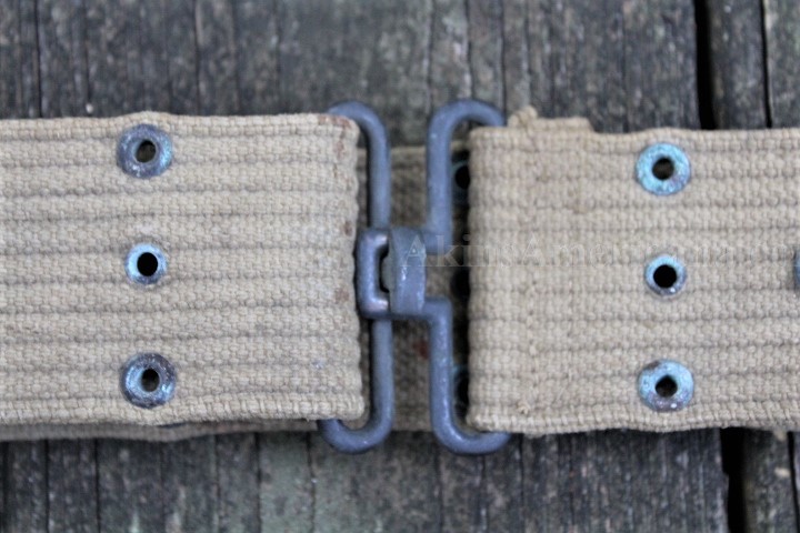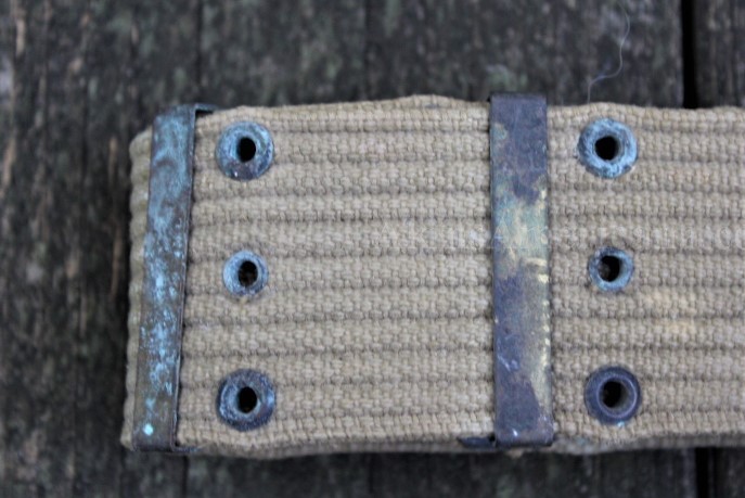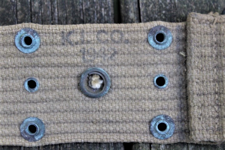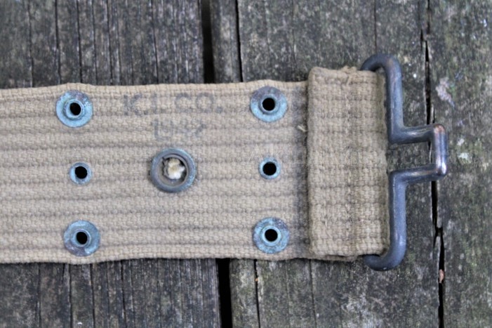 This is a US Model 1936 pistol belt used during World War II. The Khaki web belt measures 42" when fully let out, accommodating up to a 40" waist. There weren't to many fat Infantrymen back then! This one was manufactured before mid 1942, as the keepers are brass instead of steel. The belt has no stains, shows honest wear and all the eyelets are present. Some of them do have some verdigris, but that can cleaned up easily enough. It has a very distinct US stamp to the left of the ammo pouch snap. The maker mark is stamped on the inside of the belt just above the snap and reads K.I. Co./1942. This is a nice example of a Model 1936 pistol belt that saw service though the Korean War.