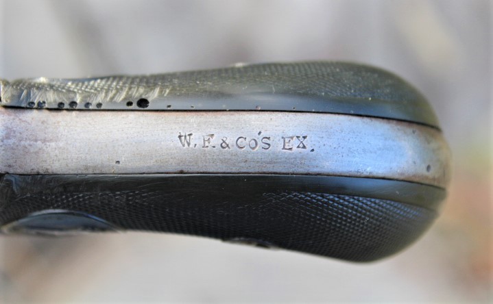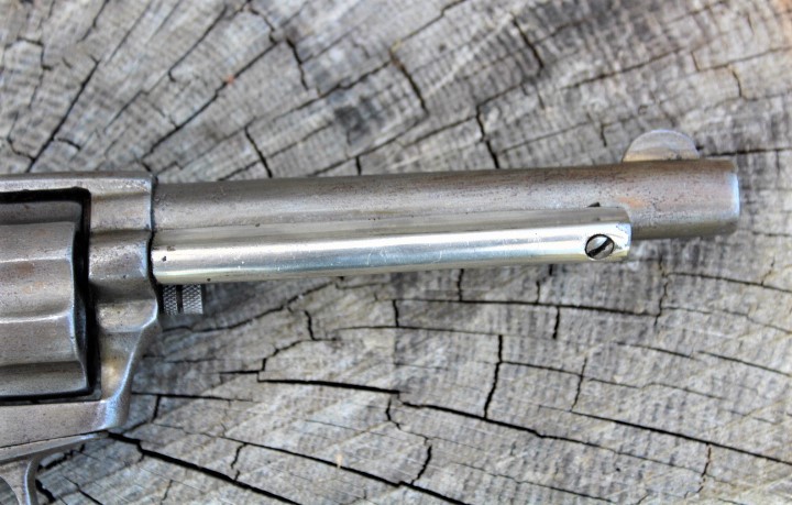 This is a copy of Colt's Model 1877 "Lightning" .38 caliber revolver made in the late 1800's. The revolver has an overall length of 9", with a barrel length of approximately 4 3/4". The metal has an overall appearance of a dull gun metal gray, with the exception of the ejector rod housing. It has been nickel plated, and retains almost all of the nickel finish. The black hard rubber grips are in good condition, showing minimal wear. The ejector rod is missing. It looks like a lanyard ring was attached to the butt of the frame at one point, but is missing as well. There are very few stamps visible on the gun, the number 92 is stamped on the bottom of the barrel, the back of the cylinder and bottom of the frame. The barrel stamp is only partially visible, and reads "COLTS SISTEME REVOLVER EUSKALDUNA T. U. y C". This is a pretty rare revolver, made by Tomas Urizar Azaldegui's shop, that appeared in the Eibar industrial register first in 1889. Combined with this rare maker is the stamp W. F. & CO'S EX. on the back strap, standing for Wells Fargo & Company Express. The double action feature of the revolver works fine. The bore is in good condition. This is a pretty rare gun, made by a Mexican gunsmith for the Wells Fargo Company. Whether you collect Colt revolvers or Wells Fargo pieces, I'm sure you don't have one of these.