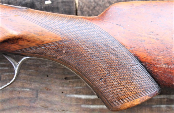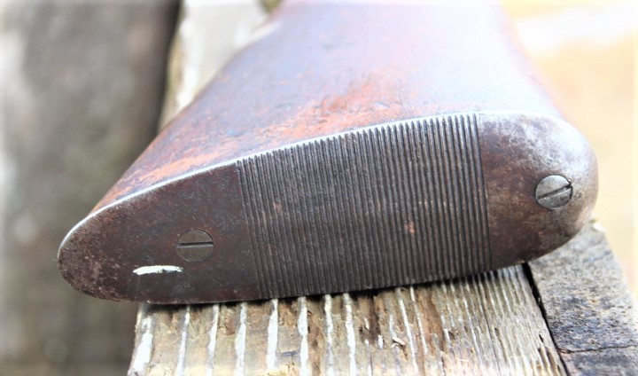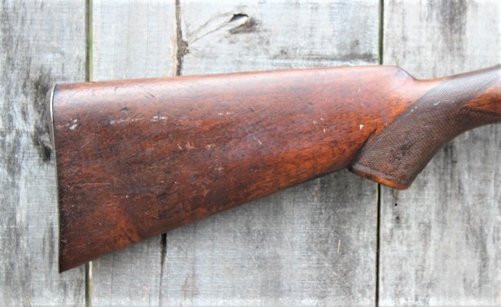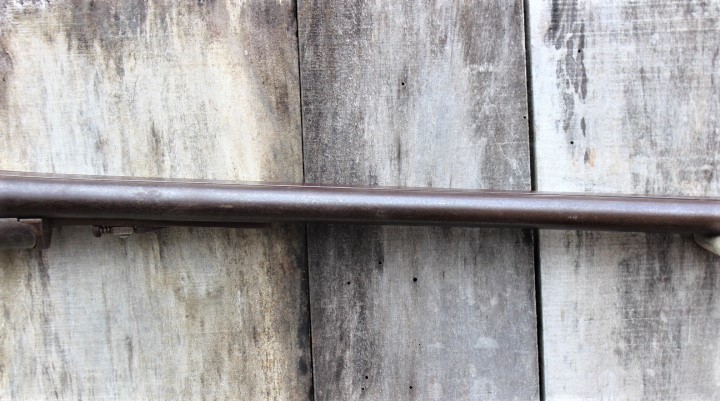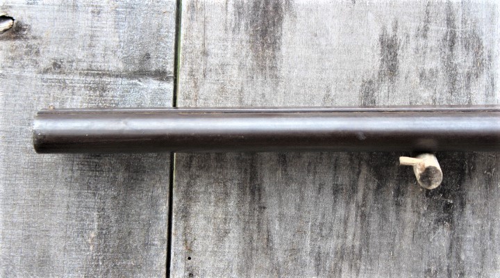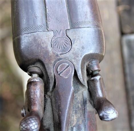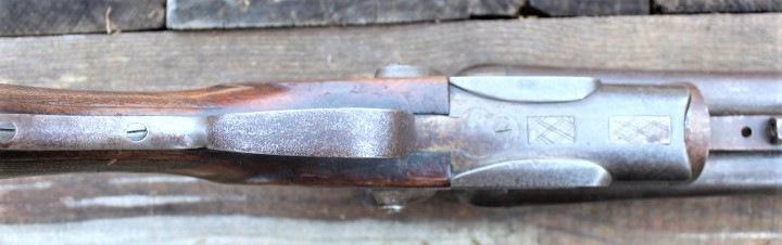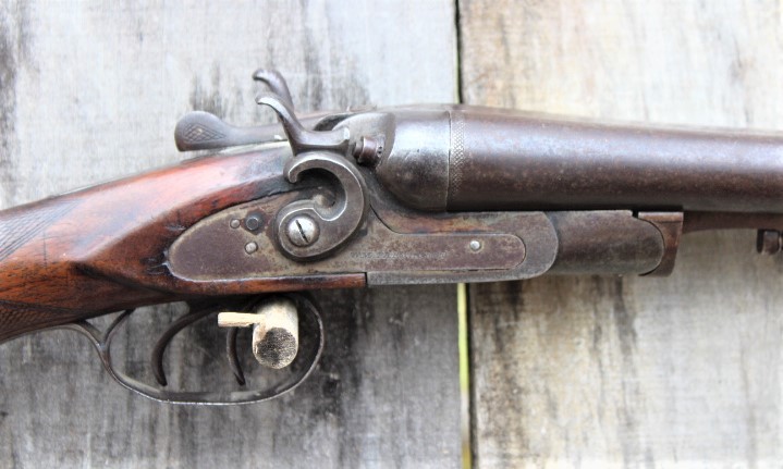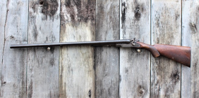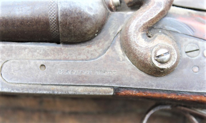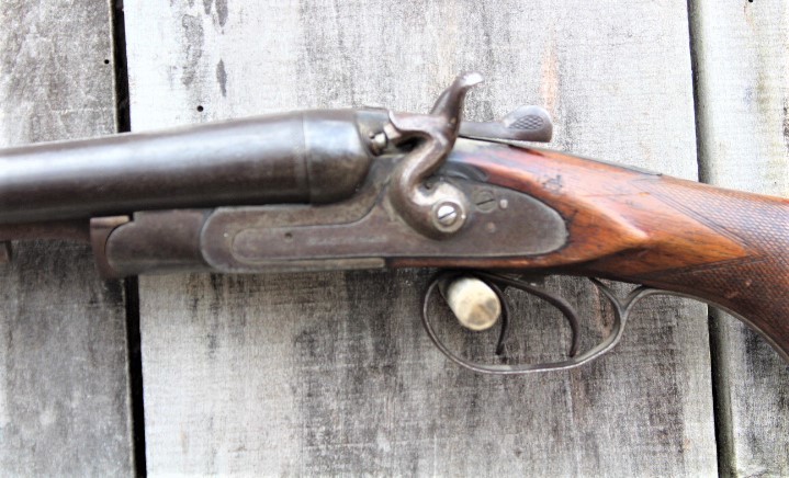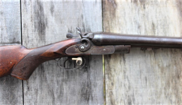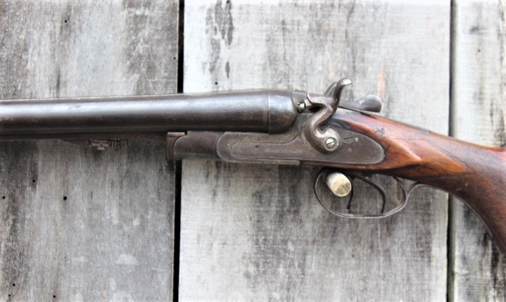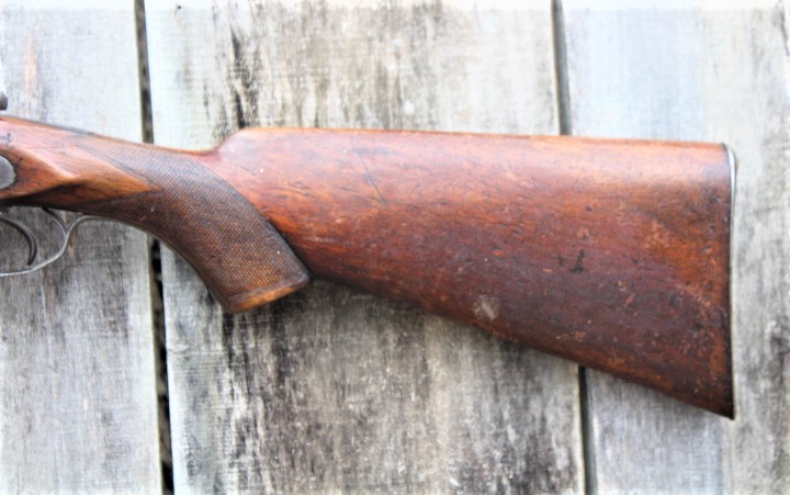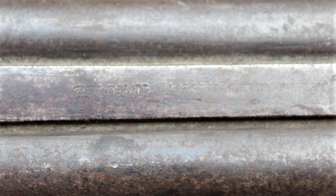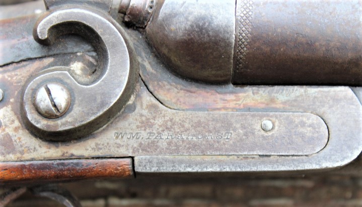This is a WM Parkhurst side by side 12 gauge shotgun manufactured in Leige, Belgium. The shotgun has an overall length of 44 3/4", with barrel lengths of 28". WM PARKHURST is a trade name used on shotguns made by Simonis, Janssen, Dumoulin and Company of Leige, Belgium. The barrels, lockplates, trigger guard, butt plate and all other hard parts have a matching steel gray patina. The exterior of the barrels have a smooth, steel gray patina with some bluing showing. The rib between the barrels is stamped "BELGIUM LAMINATED STEEL". The bores are moderately bright and have no rust, but the left barrel has a small patch of light pitting. A small brass bead sight is located 1/8" behind the muzzles on the barrel rib. The bottom of the barrels have several stamps on the flats. On the rib between the barrels the serial number of 1571 is clearly stamped. The right barrel is stamped MC, star over V, 183, four Belgian proof marks and 12 over C within a diamond. The left barrel is stamped identical minus the MC. The lug for the forehand is stamped FL. The barrel flats on the receiver have a couple of proofs, the letters FL and the serial number of 1571. The lockplates also have a very smooth appearance, with the name WM PARKHURST on the right side and MACHINE MADE on the left side. The mechanics of both locks function fine. A small inlaid silver shield adorns the bottom of the stock. The oak stock is in good condition, and shows evidence of honest in the wrist area. The wrist is checkered, and shows the wear from considerable handling. The forehand is missing from the gun. This is an inexpensive example of the late 1800's export guns coming into America that were sold all over the United States.