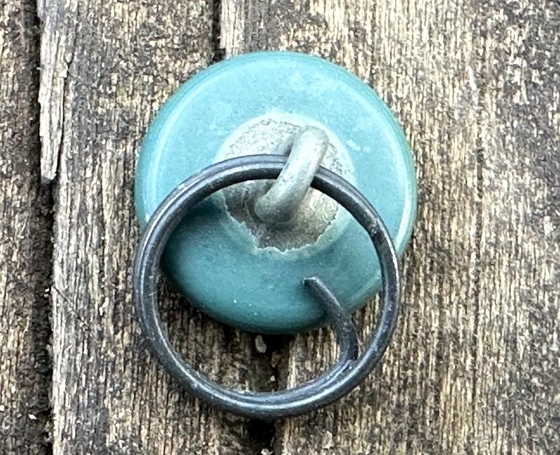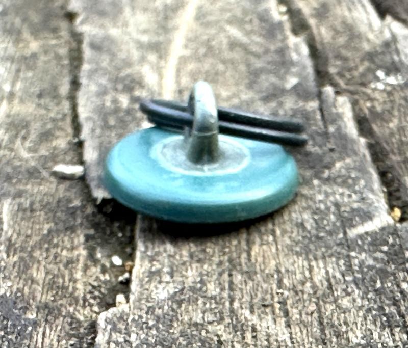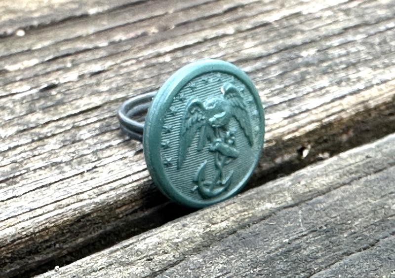 This is a single, green plastic button used on female USMC uniforms during WWII. The button measures 15mm, has a metal shank and still retains the metal ring used to secure the button to the uniform. The button face has a spread winged eagle perched on a fouled anchor, a section of the anchor line in it's beak. There are thirteen stars in an arc at the top of the button, all on a lined field. These buttons were used on the WWII female Marine's summer service uniform. The button remains in very good condition. There is no back mark on it.