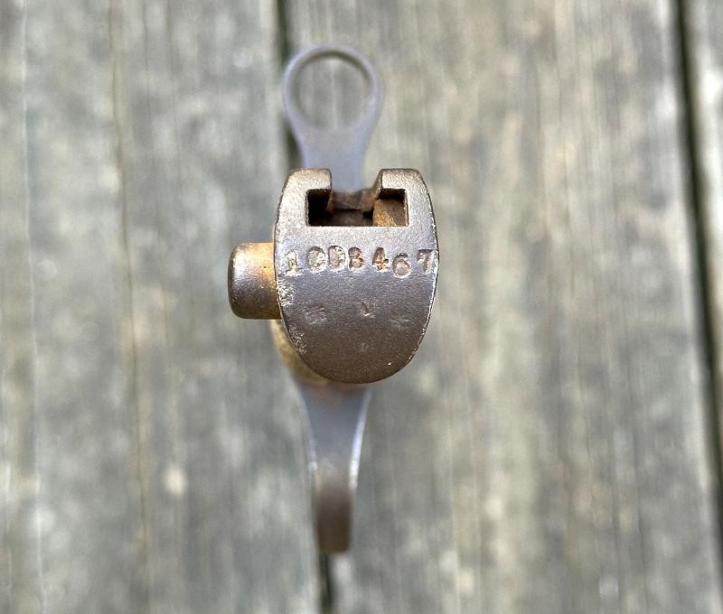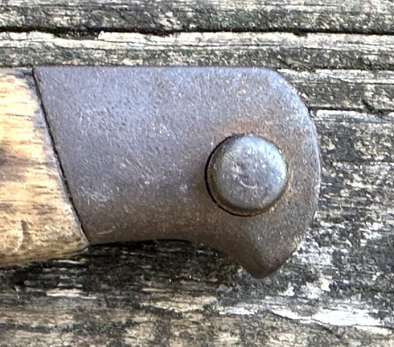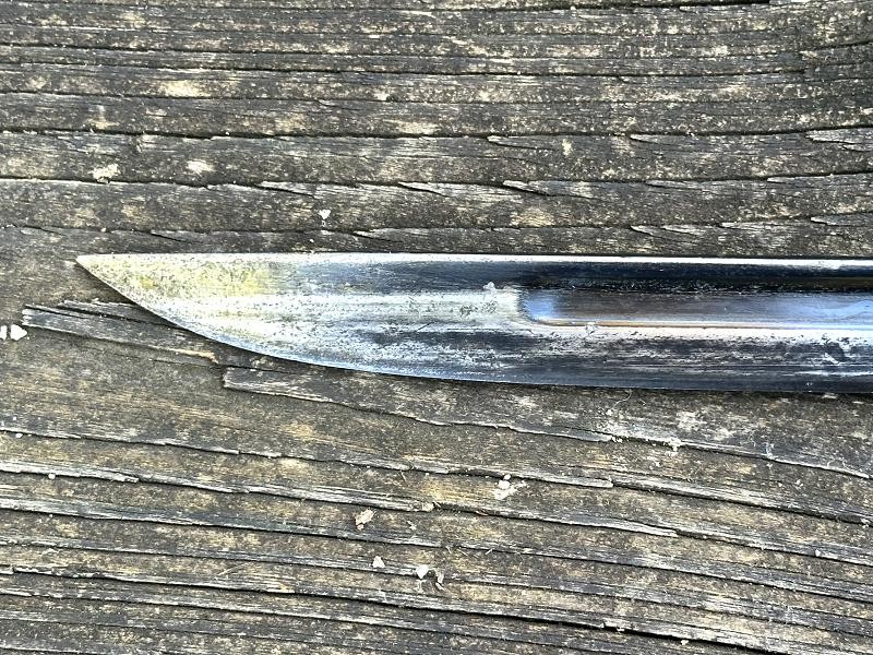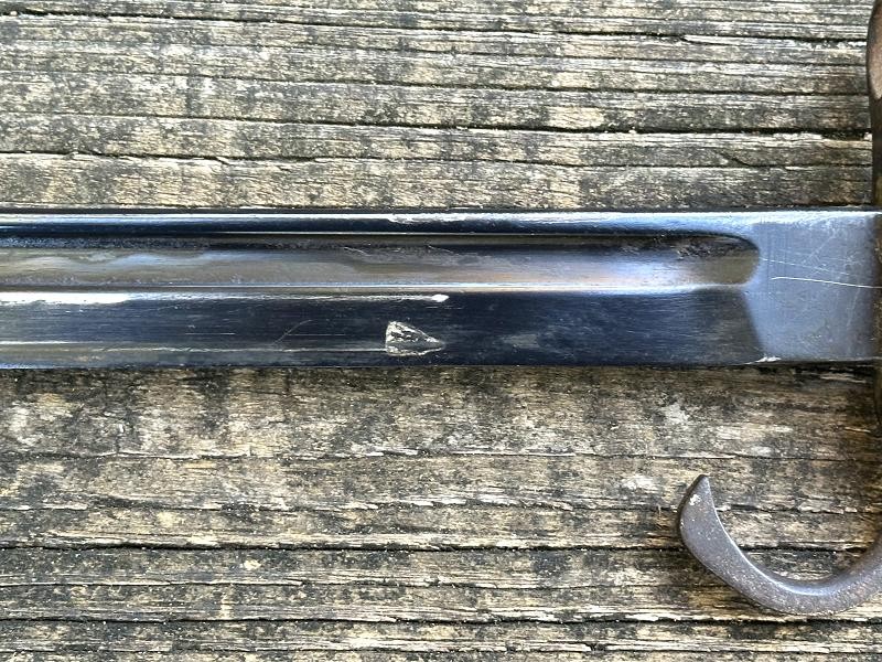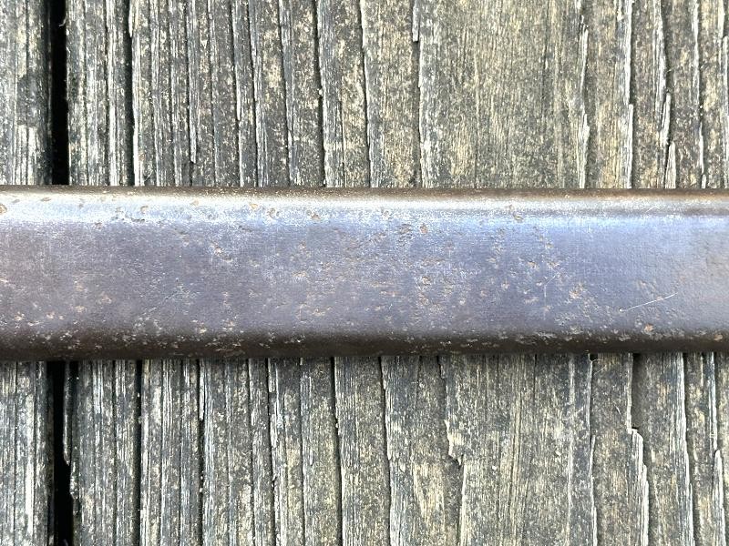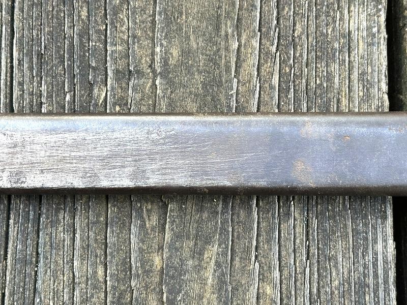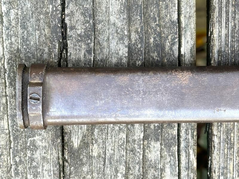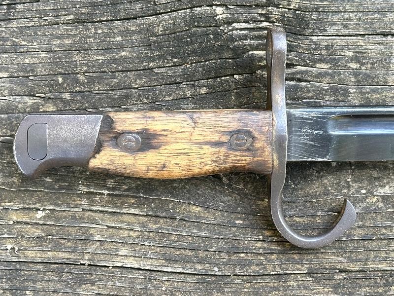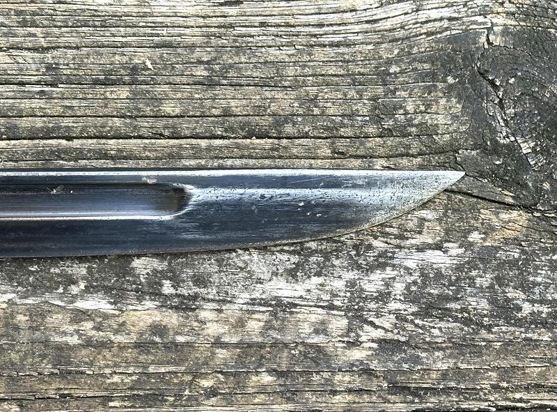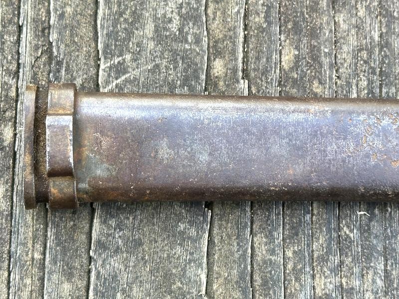 This is a Japanese Type 30 bayonet produced at the Tokyo Rigugun Zoheisho Arsenal during the pre war years of world War II. There were a total of 8.4 million of these Type 30 bayonets produced between 1897 and the end of World War II. This model bayonet saw several changes through it's lifetime. Originally, the Type 30 had a rounded bird's head pommel, contoured wrap around wood grips secured by screws and oval washers, the crossguard had a hook and the bright blade had a fuller. During the 1930's the blades began to be blued. The first modification was the removal of the hook from the crossguard. Next the grips were changed to flat sided contoured grips fastened with rivets instead of screws. The bird's head pommel went from round to flat, later being changed to rectangular. The blade fuller was the next change, being omitted. This particular Tokyo arsenal is a blued finish blade, one of only two types produced at this arsenal. The serial number is 1002467, making this Type 30 a variation B, the harder to find of the two variants. This one has an overall length of 20 1/16". The blade length is 15 11/16". The scabbard that came with this bayonet is the early metal ball-tipped scabbard measuring 16 5/16" in length. The muzzle ring measures 9/16". The bayonet is in very good condition. The blued, fullered blade is very clean, no pitting at all! The finish is good on the crossguard, pommel and tang. The obverse side of the blade has a crisp Tokyo arsenal stamp. The contoured wood grips are in good condition. They are retained by two screws with two oval washers in the right grip and two oval washers in the left grip. The metal scabbard is in fair condition. It retains some of the bluing, five dents near the bottom and a couple of areas with light pitting. This is a common bayonet according to Raymond Labar's book, "Bayonets of Japan". If you collect WWII Japanese items take a good look at this one!