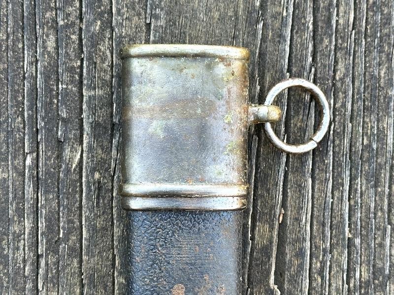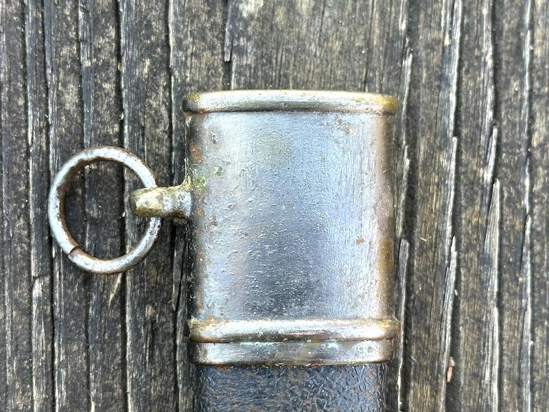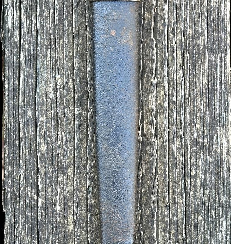 This is a veteran bring back German Luftwaffe dagger assembled from parts from WWII. The dagger is in the style of a 1st pattern Luftwaffe officer's dagger, but has many differences. It has an overall length of 13 3/4", with a blade length of 8 1/2". The blade is not the typical 1st pattern design, and appears to be a cut down sword blade. It is a double edge, spear point design with a median ridge running from the cross guard to the almost the tip of the blade. The blade is maker marked with the seated king over SMF over Solingen on one side. The mark is stamped in the blade, not etched. There is no Luftwaffe acceptance stamp on the blade. The blade and fitting all have the same aged patina. The cross guard is the typical "winged" quillion with a recessed swastika in the square center piece. Instead of the standard Moroccan blue pebbled leather grip this one has a reddish brown pebbled leather grip. The pommel caps on these are usually round with a swastika in the center, but this one has a more traditional pommel cap. The scabbard is a pebbled black leather covered metal type, normally these are the same blue color as the grip. The scabbard has a top mount with a suspension ring and a drag. The scabbard fittings have a patina that matches the dagger fittings. This is definitely an unusual dagger and may be a one of a kind made up from parts.
