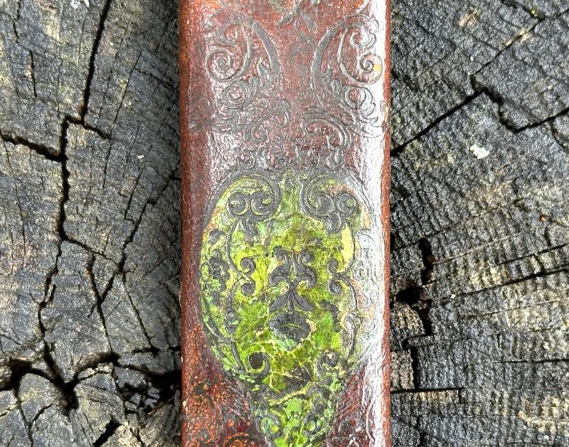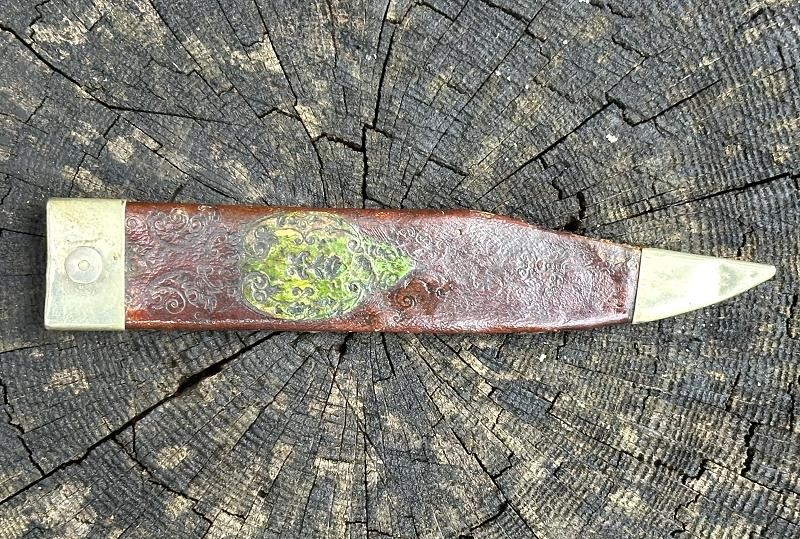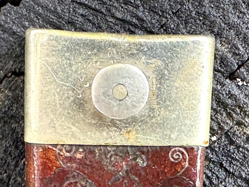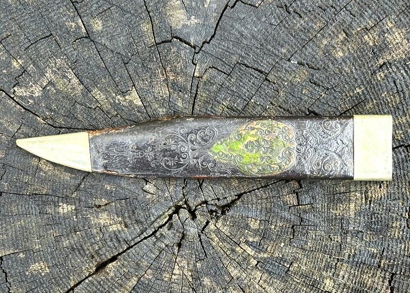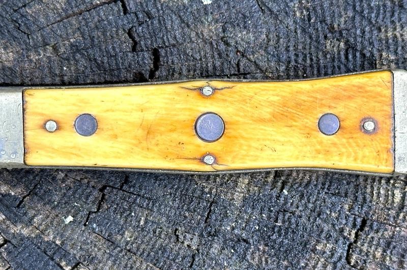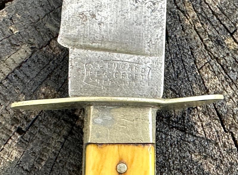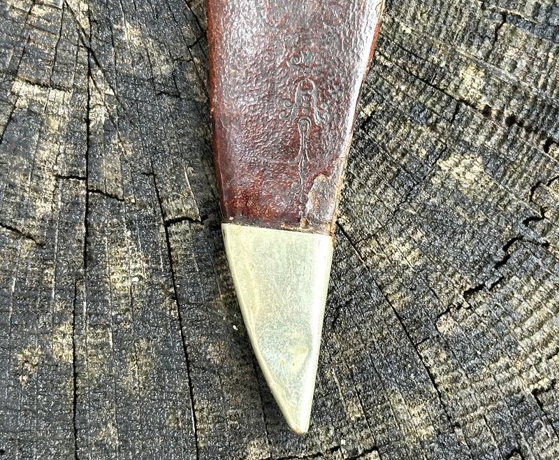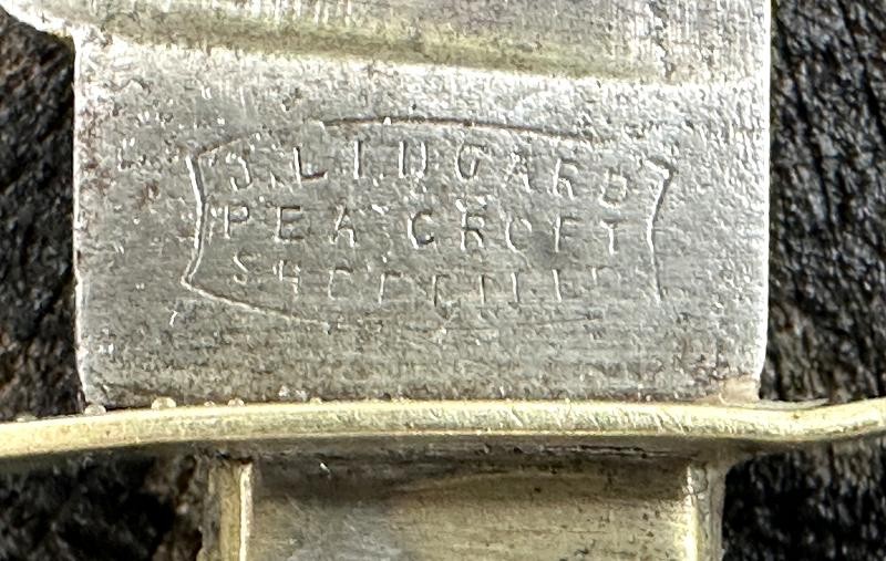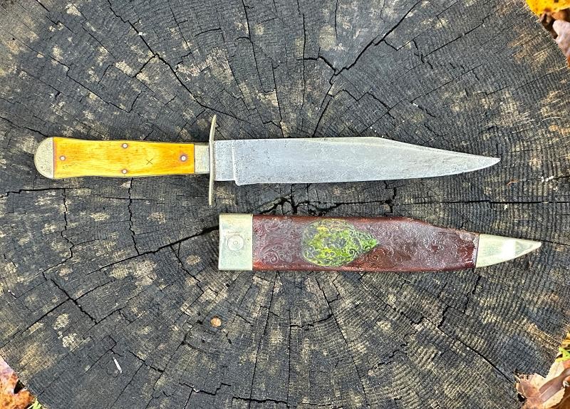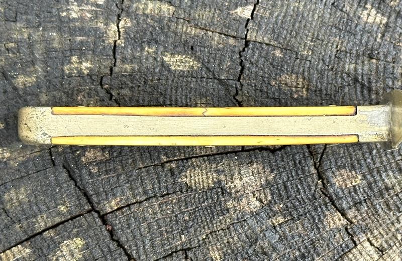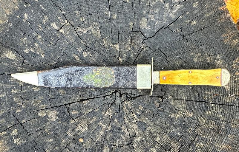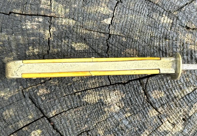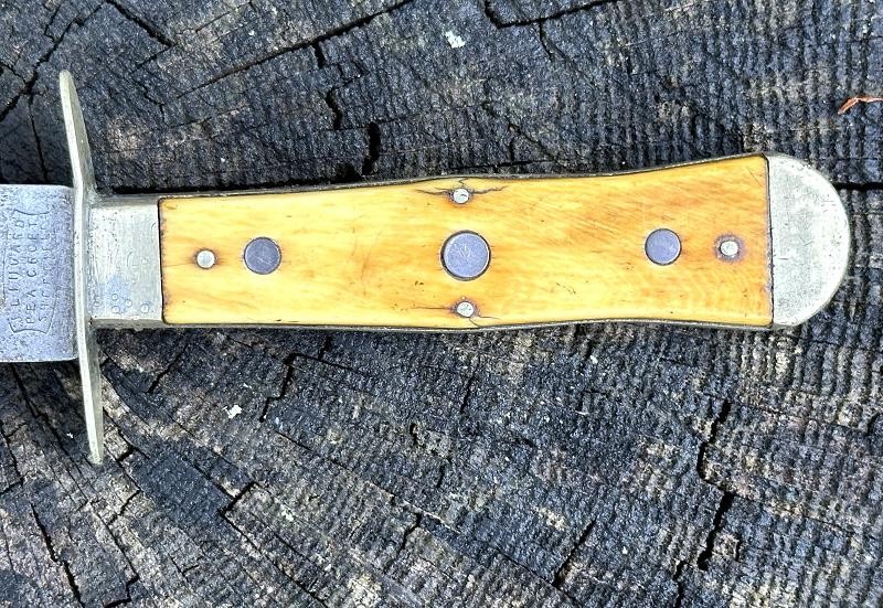 This is a clip point single edged side knife made by John Lingard circa 1830-1850. The knife measures 11" overall, with a 6 3/4" blade. The blade still has a bright, non pitted appearance. It looks as this one may have been acid etched originally, but there are only scattered spots left now. The obverse ricasso is marked J. LINGARD/PEA CROFT/SHEFFIELD within a banner. The reverse ricasso is unmarked. The cross guard is a simple elliptical design of German silver. The grip is made of two ivory slabs secured by four German silver pins. The obverse grip is inlaid with three silver disc's, the reverse side is bare. The blade has a 1/8" spine, making it pretty sturdy for it's length. The blade is in good condition with small spots of oxidation. The grip has no chips, just two very small cracks at the bottom center pins. The leather scabbard is in very good condition and features German silver fittings. It shows use but remains in very good condition. There are plenty of Civil War period images with these type knives stuck in the belts of both Union and Confederate soldiers. This clip point side knife will make an excellent addition to any Civil War collection.