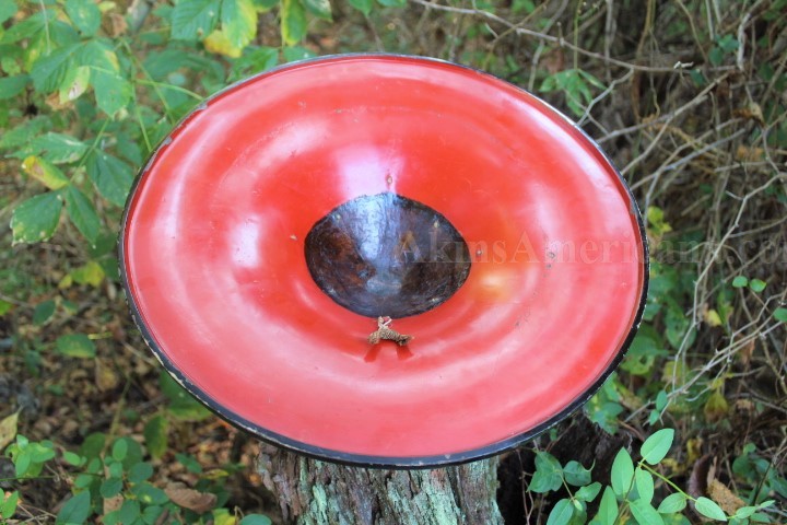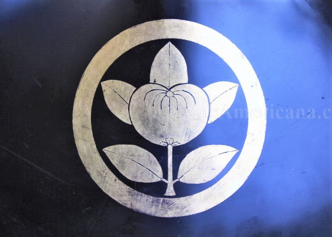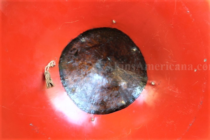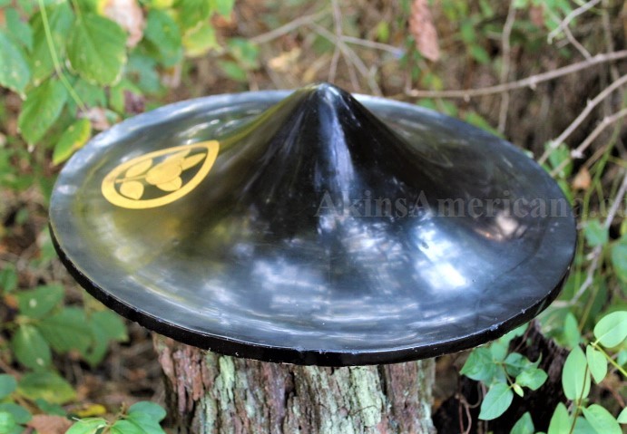 This is a wooden Jingasa helmet used by the Japanese Samurai during the Edo period, between 1603 and 1868. The samurai wore the lightweight Jingasa while traveling or when in a camp setting. This one is made of wood and has a black lacquer finish on the outside, with the interior of the helmet having a red lacquer finish. A family Mon, or crest, is done in gold leaf on the front of the helmet. There are no cracks or wood loss anywhere on the helmet, just some minor chipping of the lacquer around the rim of the helmet. The interior of the rim has some small areas of the red lacquer flaking off, and one or to small chips. The cloth head pad and padded chin strap are missing from the helmet. The helmet has a diameter of 16 1/4". This Jingasa helmet is from the late Edo period, somewhere between the 1840's and the 1860's. It has some awesome display power and great eye appeal!
