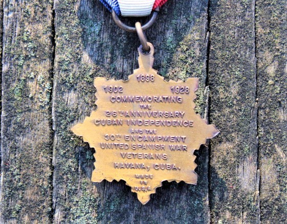 The United Spanish War Veterans organization was the result of three large Span-Am veterans groups merging in 1904. It's members were veterans of the Spanish American War, Philippine American War and the China Relief Expedition. This USWV medal is for veterans attending the 26th National Encampment held in Havana, Cuba in 1928. The badge is 3 3/4" tall, with the hanger being 2" wide. The hanger is a rectangle with s small piece of card stock inserted so the veteran could write his name on it. Suspended below the hanger is a red, white and blue ribbon. Suspended from the ribbon is an eight point medallion with the Coat of Arms for Cuba in the center. In an arc above and below the coat of arms in raised letters is "REPUBLICA DE CUBA". The ribbon is is in very good condition, no frays rips or tears and the colors are still very vibrant. The header is back marked WHITEHEAD & HOAG. The back of the medal is stamped with the dates 1898 in the center and 1902 on the left and 1928 on the right. Under the dates the inscription "COMMEMORATING/the/26th ANNIVERSAY/CUBAN INDEPENDENCE/and the/30th ENCAMPMENT/UNITED SPANISH WAR/VETERANS/HAVANA, CUBA. MADE/in/U.S.A. This reunion medal is in very good overall condition and will enhance any USWV reunion collection.