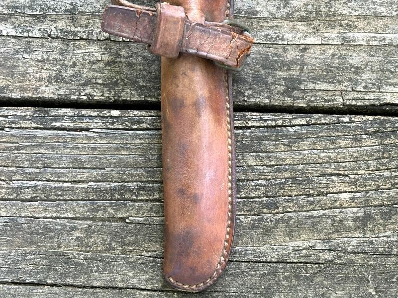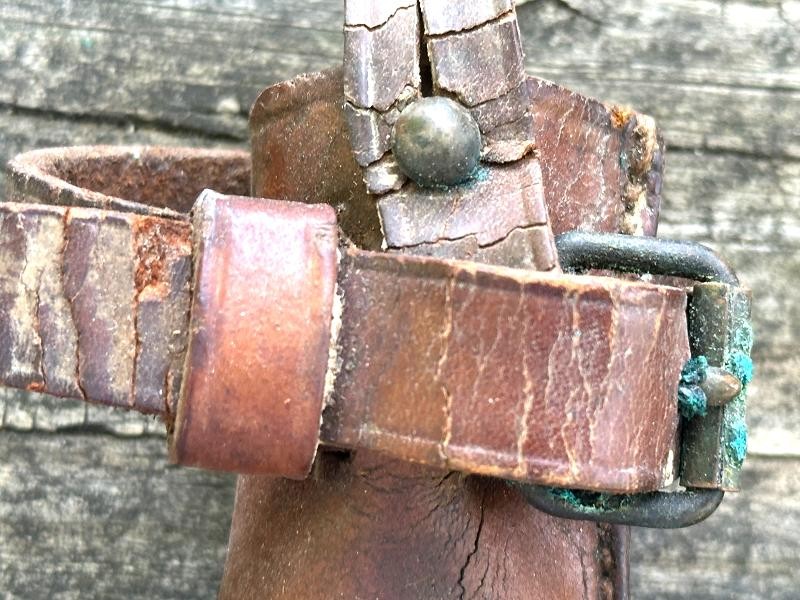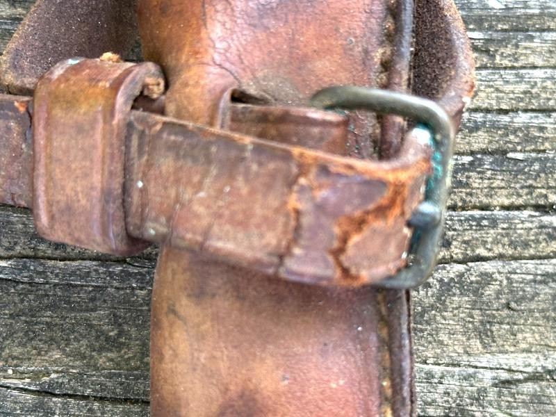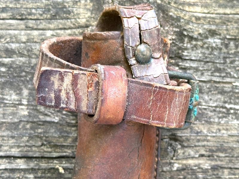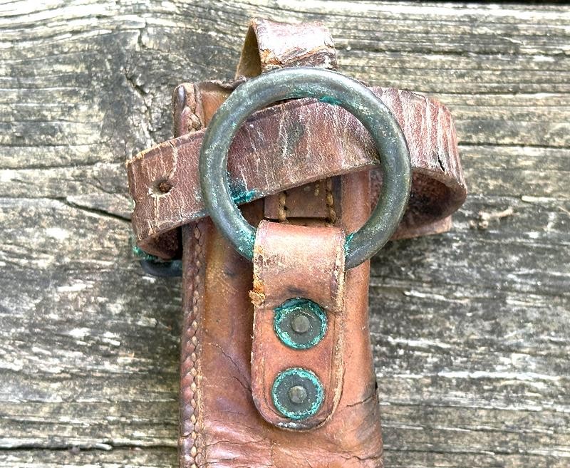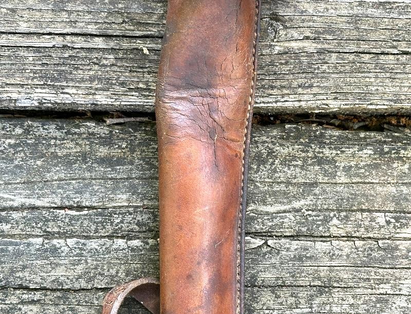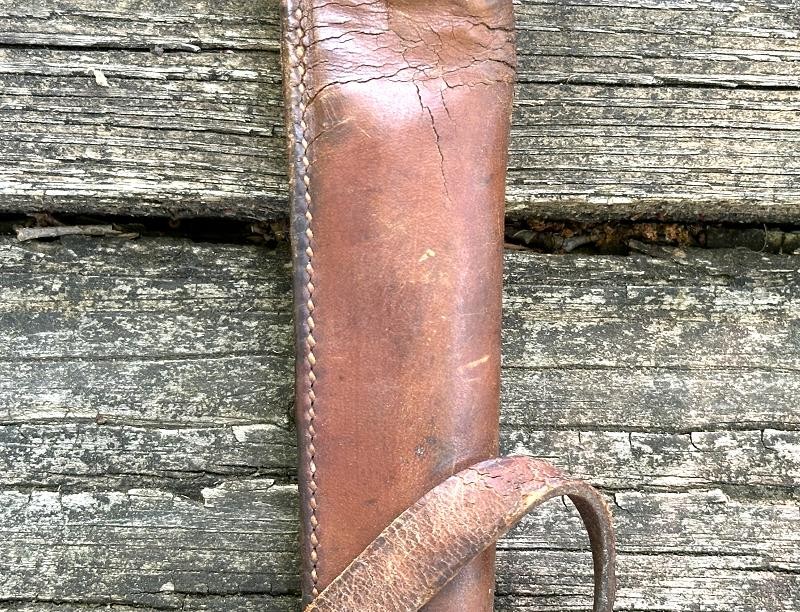 This is a US M1912 picket pin scabbard from the World War I period. The scabbard measures 13" in length and 2" at the widest point. The top and bottom straps are complete and the retaining strap for the pin is still present. The leather is a russet brown color and remains very supple. All the original stitching is tight and unbroken. Both straps retain the roller buckles, and the ring on the back of the scabbard is still present.