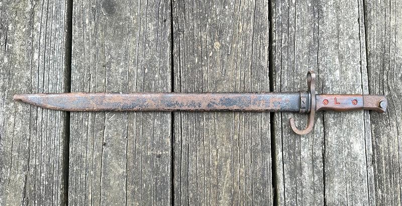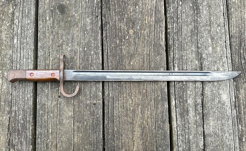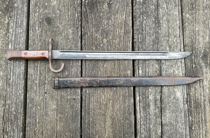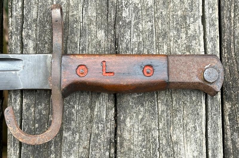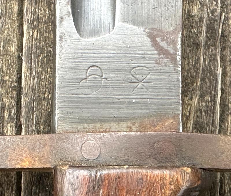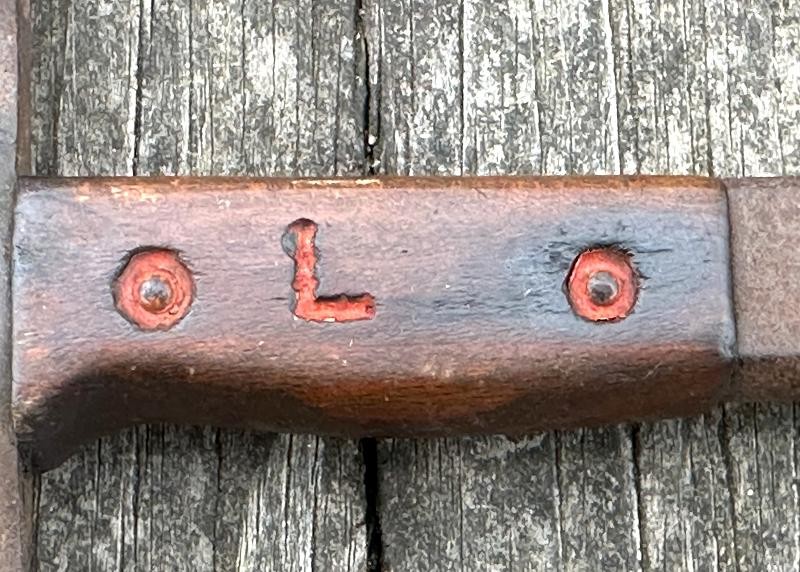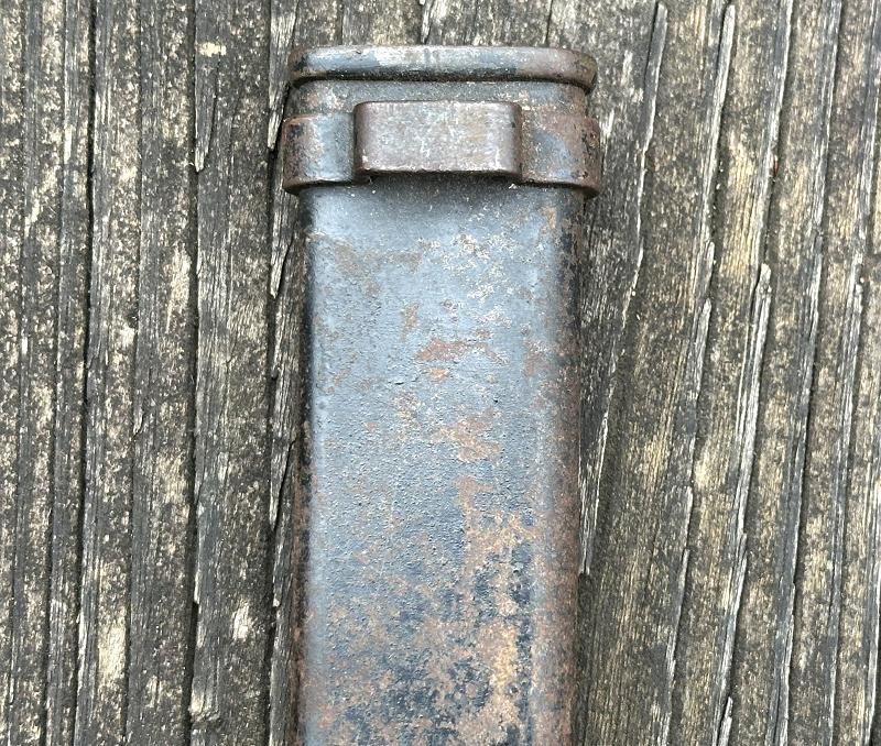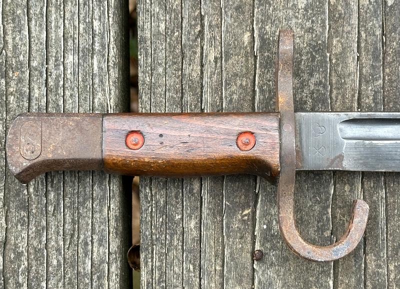 This is a Japanese Type 30 bayonet produced at the Hikari Seiki Seisakusho Arsenal during the pre war years of world War II. There were a total of 8.4 million of these Type 30 bayonets produced between 1897 and the end of World War II. This model bayonet saw several changes through it's lifetime. Originally, the Type 30 had a rounded bird's head pommel, contoured wrap around wood grips secured by screws and oval washers, the crossguard had a hook and the bright blade had a fuller. During the 1930's the blades began to be blued. The first modification was the removal of the hook from the crossguard. Next the grips were changed to flat sided contoured grips fastened with rivets instead of screws. The bird's head pommel went from round to flat, later being changed to rectangular. The blade fuller was the next change, being omitted. This particular "Tokyo Hourglass" arsenal bayonet is a blued finish blade, one of ten variations produced at this arsenal. The serial number is on this one is obscured by the rust on the tang, but it looks to be an early war production. This one has an overall length of 20 1/8". The blade length is 15 11/16". The scabbard that came with this bayonet is the correct metal tubular-tipped scabbard measuring 16 7/16" in length. The muzzle ring measures 9/16". The bayonet is in very good condition, but does suffer from surface rust on the crossguard, tang and pommel. The blued, fullered blade is very clean, with very minimal pitting! The finish is almost completely gone on the crossguard, pommel and tang, replaced by a rusty brown patina. The obverse side of the blade has a crisp Hikari Seiki arsenal stamp. The contoured wood grips are in good condition, the letter L has been carved into the reverse grip and painted red. They are retained by two screws with two oval washers in the right grip and two oval washers in the left grip, also painted red. The metal scabbard is in fair condition. It has been painted black at some point, and retains the majority of that finish. There is light surface rust and pitting over the entire surface of the scabbard. This is a common bayonet according to Raymond Labar's book, "Bayonets of Japan". If you collect WWII Japanese items take a good look at this one!