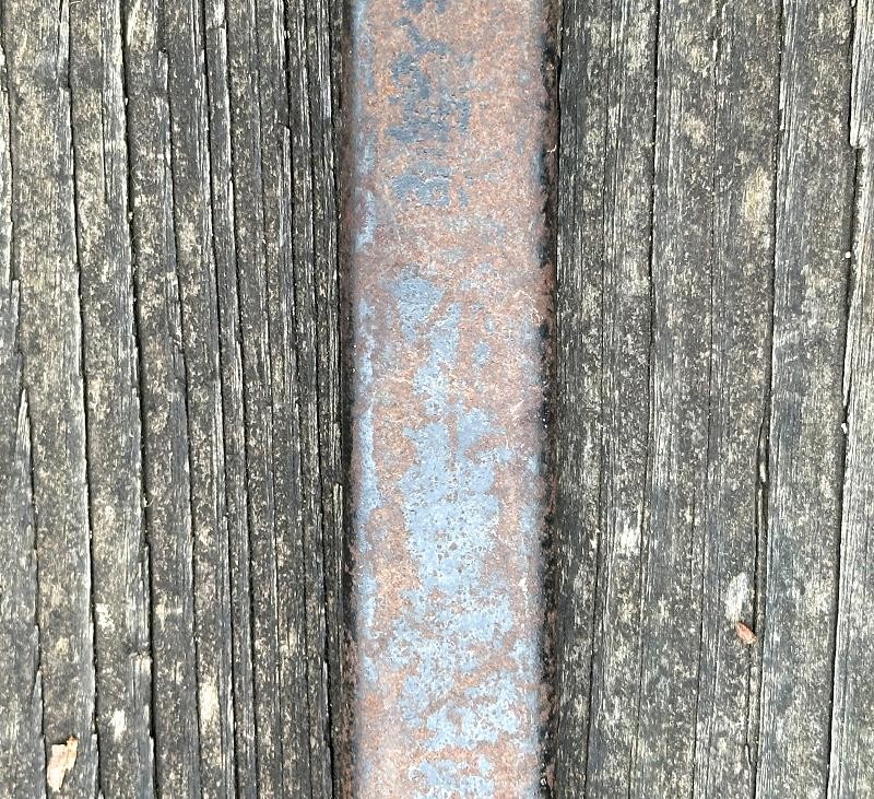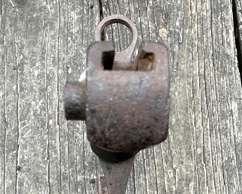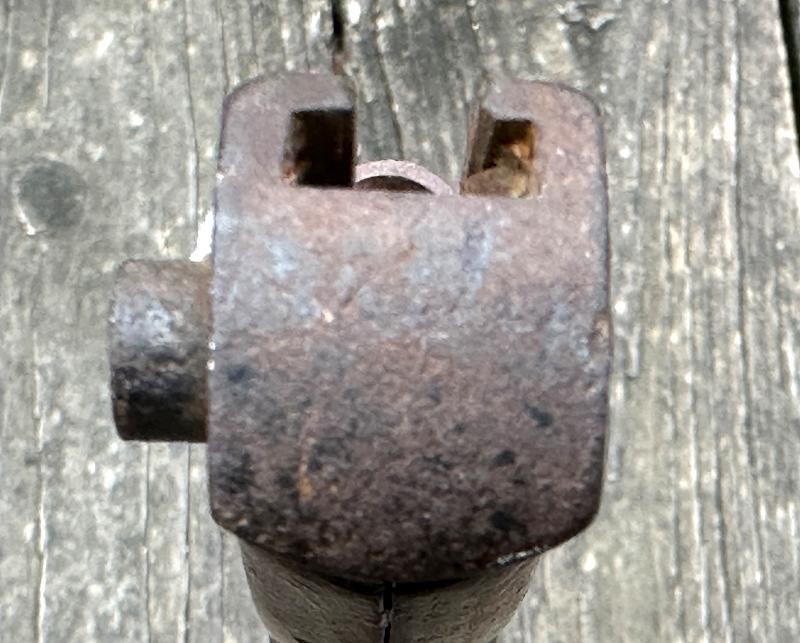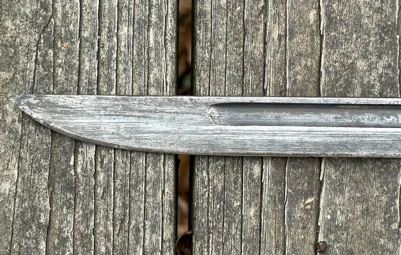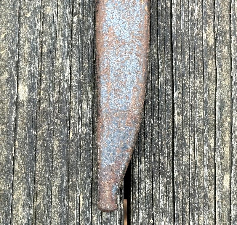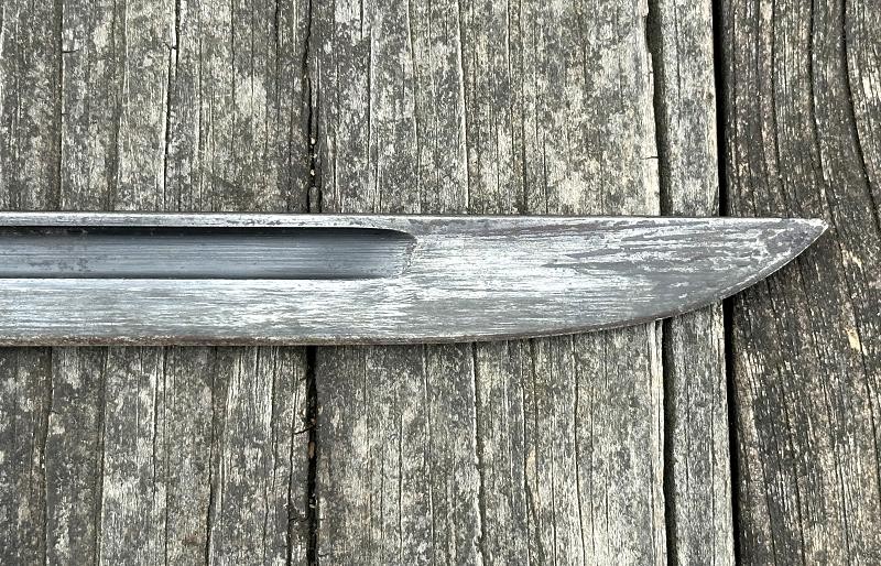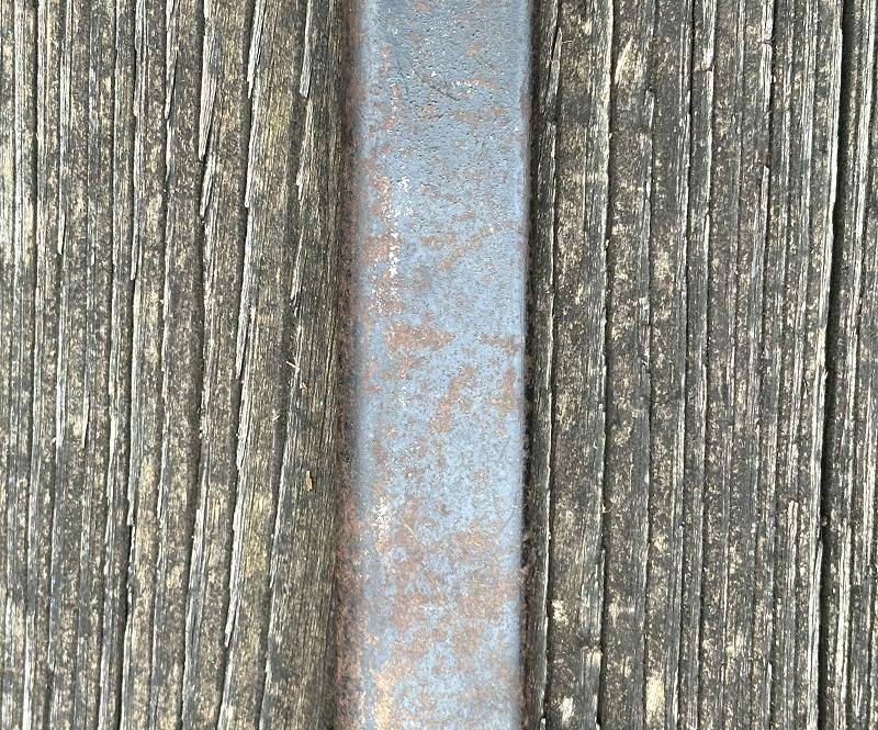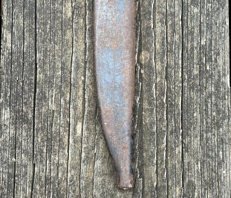 This is a Japanese Type 30 bayonet produced at the Hikari Seiki Seisakusho Arsenal during the pre war years of world War II. There were a total of 8.4 million of these Type 30 bayonets produced between 1897 and the end of World War II. This model bayonet saw several changes through it's lifetime. Originally, the Type 30 had a rounded bird's head pommel, contoured wrap around wood grips secured by screws and oval washers, the crossguard had a hook and the bright blade had a fuller. During the 1930's the blades began to be blued. The first modification was the removal of the hook from the crossguard. Next the grips were changed to flat sided contoured grips fastened with rivets instead of screws. The bird's head pommel went from round to flat, later being changed to rectangular. The blade fuller was the next change, being omitted. This particular "Tokyo Hourglass" arsenal bayonet is a blued finish blade, one of ten variations produced at this arsenal. The serial number is on this one is obscured by the rust on the tang, but it looks to be an early war production. This one has an overall length of 20 1/8". The blade length is 15 11/16". The scabbard that came with this bayonet is the correct metal tubular-tipped scabbard measuring 16 7/16" in length. The muzzle ring measures 9/16". The bayonet is in very good condition, but does suffer from surface rust on the crossguard, tang and pommel. The blued, fullered blade is very clean, with very minimal pitting! The finish is almost completely gone on the crossguard, pommel and tang, replaced by a rusty brown patina. The obverse side of the blade has a crisp Hikari Seiki arsenal stamp. The contoured wood grips are in good condition, the letter L has been carved into the reverse grip and painted red. They are retained by two screws with two oval washers in the right grip and two oval washers in the left grip, also painted red. The metal scabbard is in fair condition. It has been painted black at some point, and retains the majority of that finish. There is light surface rust and pitting over the entire surface of the scabbard. This is a common bayonet according to Raymond Labar's book, "Bayonets of Japan". If you collect WWII Japanese items take a good look at this one!