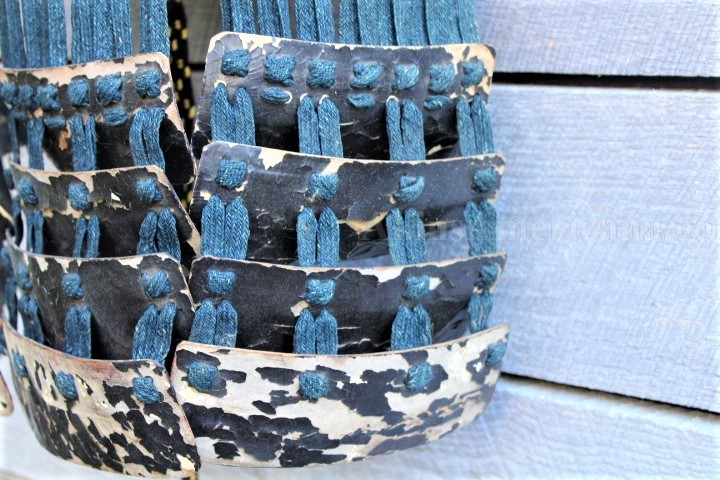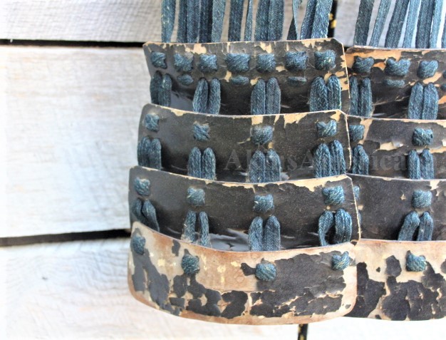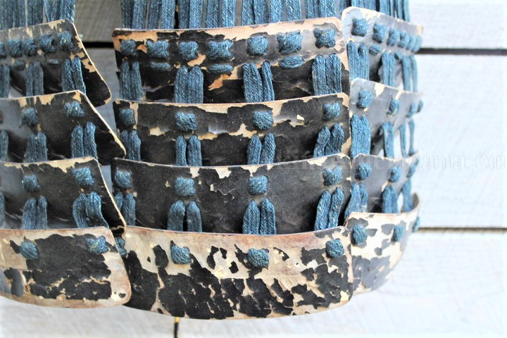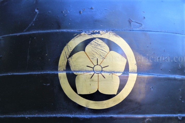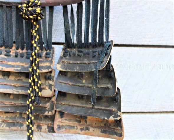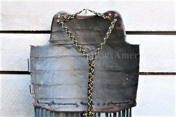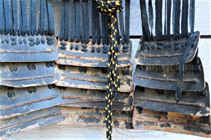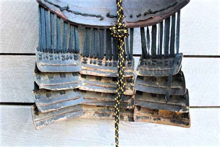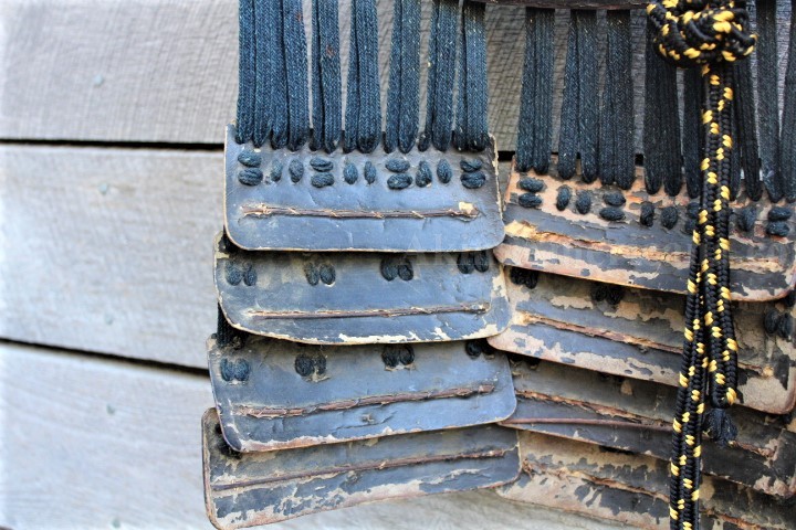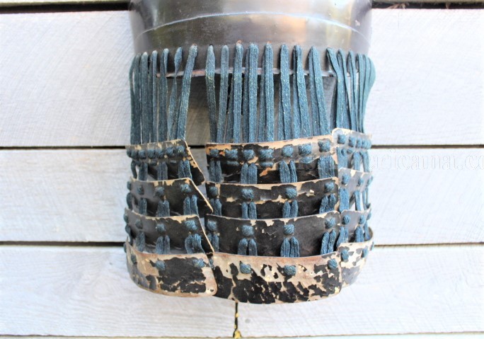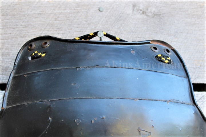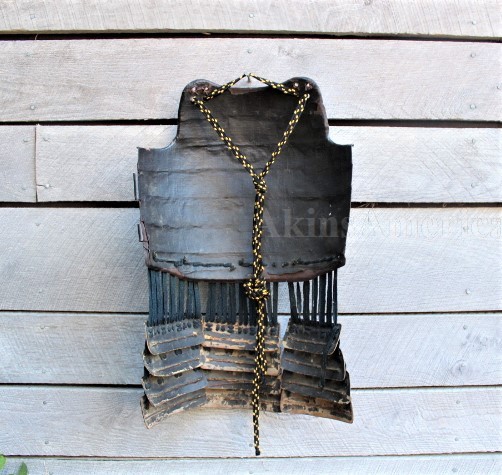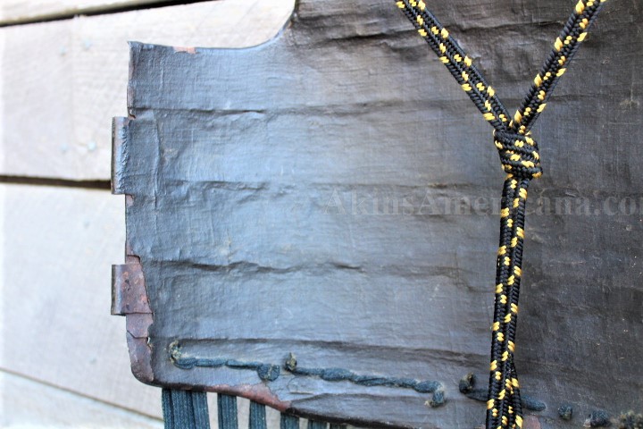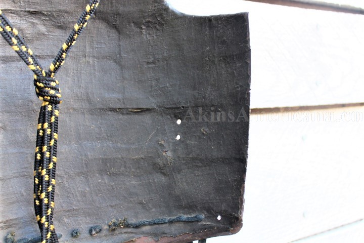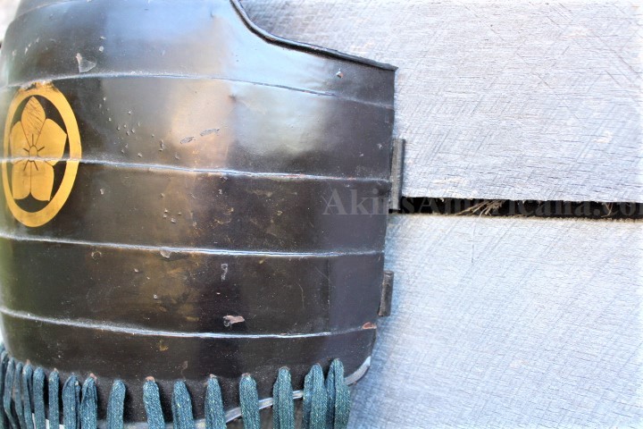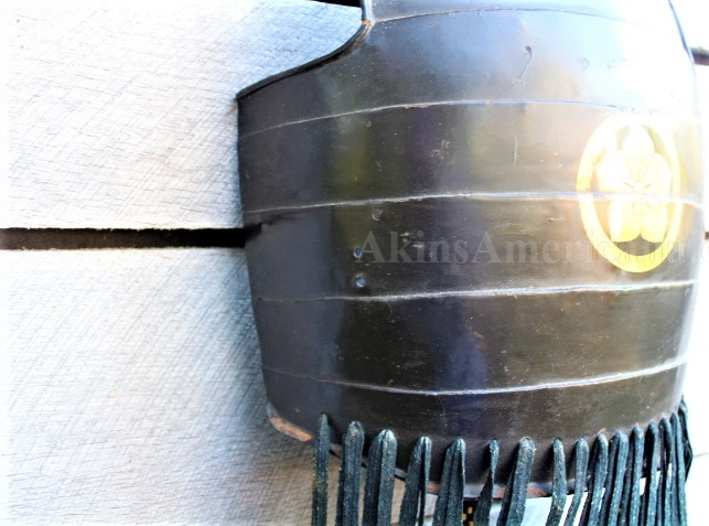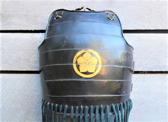 This is the front section to an Edo Period Samurai Cuirass, or Dou, circa 1820's - 1860's. A full set of armor would include the chest armor (Dou), iron or leather plates hanging from the front and back of the Dou to protect the hips and upper legs (Kusazuri), iron or leather rectangular plates to protect the shoulders (Sode), armored glove like sleeves to protect the forearms (Kote), a helmet made of iron or leather plates ranging from 3 to 100 to protect the head (Kabuto} some times with a neck protector (Shikoro), facial armor made of leather or iron (Mengu or Menpo), small guards made of cloth with small iron or leather guards to protect the thighs (Haidate) and shin guards made of iron splints connected by chain armor (Suneate). This front section of the Dou is made or five horizontal iron plates riveted together. It has been lacquered black to help protect the iron plates from the harsh Japanese climate. The inside of the guard has been layered with strips of cloth to provide a little cushion, then lacquered also. This particular Duo has been hinged on the left side below the arm pit. It has been embellished with a gold Mon, or family crest, of a Mum. There are no other decorations or embellishments, so this one was probably worn by a non ranking samurai. The Kusazuri consists of three sets of leather guards, made of four plates each hung horizontally from the bottom of the Duo. All four have been lacquered black and have no markings or decorations. The Kusazuri are suspended from the Duo with blue woven cord. While it may not be as flashy as the other Duo listed on the website, it still has some killer display power!
