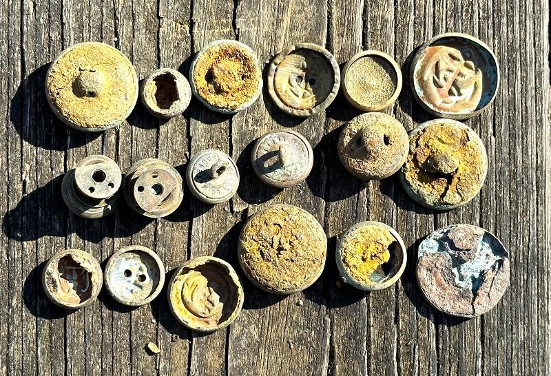 This is a group of eighteen assorted naval buttons. There are ten coat size buttons, six cuff size buttons and two cap buttons. The majority of the buttons are US Naval buttons, but there are a couple that are either foreign navies or non military buttons. All are of a two piece design, some use shanks and others were retained by rings. I believe all of them are from the 1900's. I have no history of where these came from. They are not excavated, but have been exposed to the elements as all have rust and corrosion on them.