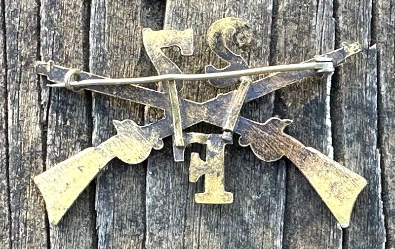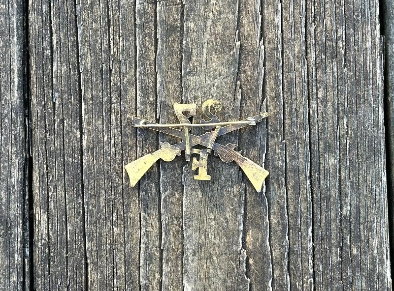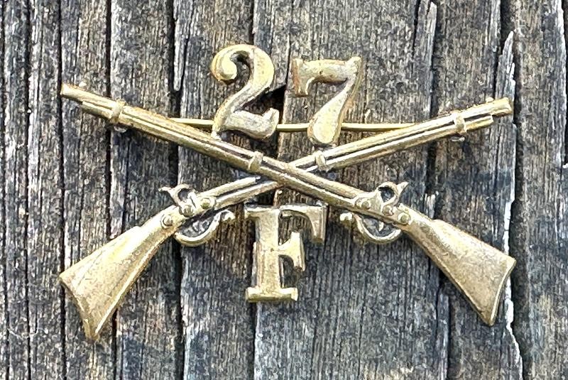 This is an Infantry cap or hat insignia from the Spanish American War period. It measures 2 5/16" wide and 1 1/2" tall. It is made of brass and still has a little shine to it. It is made up of Model 1795 flintlock rifles that are crossed with the regimental number 27 in the upper quadrant and the company letter F in the lower quadrant. General Order Number 21, dated 20 March, 1876, directed that the letter of the company will be placed in the lower angle and the number of the regiment in the upper angle. This set represents Company F of the 27th Infantry Regiment, having served since it's formation in 1901 through present day. The pin is still present and closes properly. This would look great displayed on a Model 1889 campaign hat!